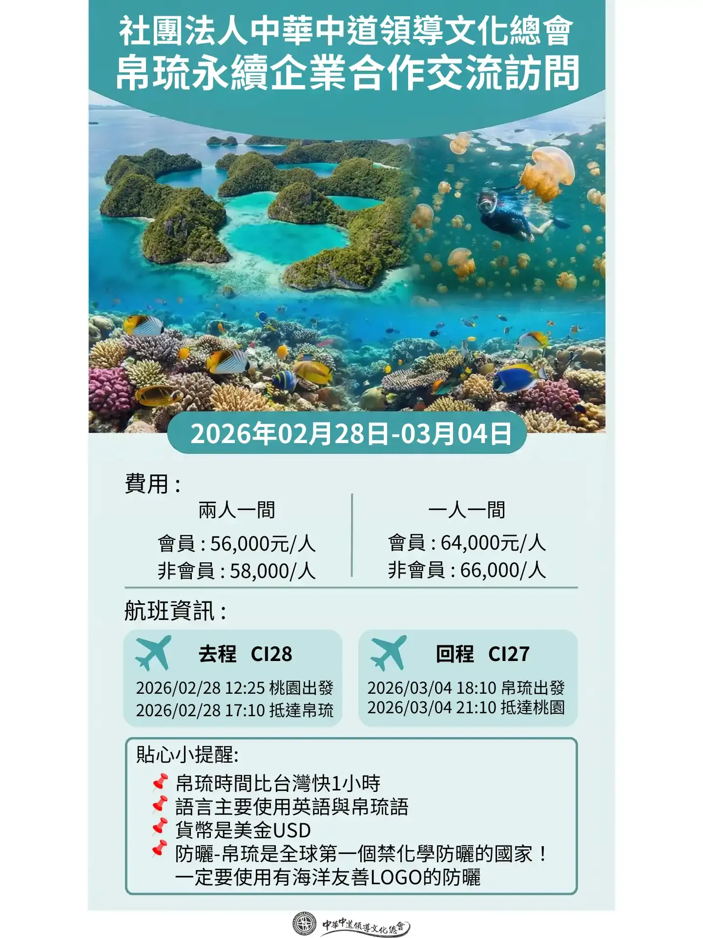 跟著中華中道領導文化總會,前往被譽為「上帝水族箱」的帛琉!五天四夜深度行程,探索世界遺產洛克群島的絕美海景,更將拜會我國駐帛琉大使館陳剛毅大使、帛琉觀光部長,並參訪國合會水產養殖中心——在碧海藍天中,展開一場兼具國際交流與永續探索的智慧之旅。